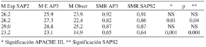 Resultados: La mortalidad hospitalaria observada global fue del 22,2% contra una esperada según el SAPS2 de 26,2% (p < 0,01, SMR 0,85) y según el APACHE III de 26,4% (p < 0,01, SMR 0,84).