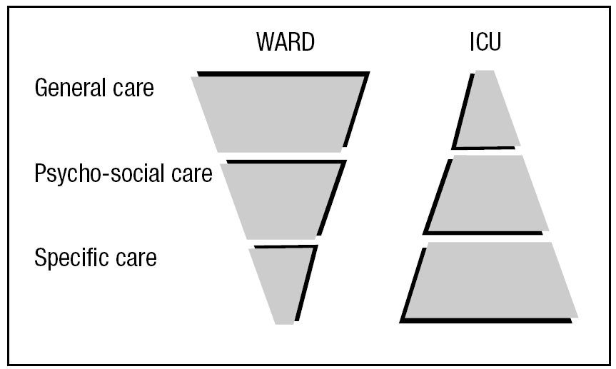 For reasons of effectiveness and efficiency, the ICU has a much higher concentration of both staff and technology in comparison with the ward. Considering the available technology is subsidiary to the knowledge and skills of the staff, the relevant difference between ICU and ward concerns the concentration of staff: the P/N ratio in the ICU varies between 1 and 3, whereas in the ward it varies between 10 and 20.