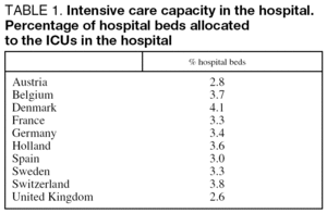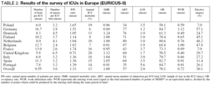 In a multinational study published in 19902, Abizanda has reported that the number of ICU beds allocated per hospital was highly variable with the country (between 2.6% in the UK and 4.1% in Denmark), and always smaller than the recommended figures (table 1). In this context, the results of the EURICUS-I study were very surprising (table 2): the occupancy rate (OR) of the facilities varied largely and apparently not in direct relation to the percentage of beds allocated to CCM. Besides, the overall OR was low (70%).