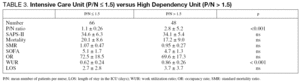 We have looked in more detail to «staffing», the other identifier of admissions to these facilities. Using the data of 114 ICUs in the database of EURICUS, the units were divided into two groups (table 3): the «ICU Group», with P/N ratio < 1.5, and the «HDU Group» with P/N ratio > 1.5. The patients in the two groups did not differ regarding severity of illness (SAPS-II) nor regarding intermediate (SOFA) and final outcomes (mortality). The «performance» measurements considered (SMR, OR and LOS) did not differ. The only significant differences concerned obviously the parameters related to the selection of the groups: P/N ratios and WUR. These results allow us to conclude: