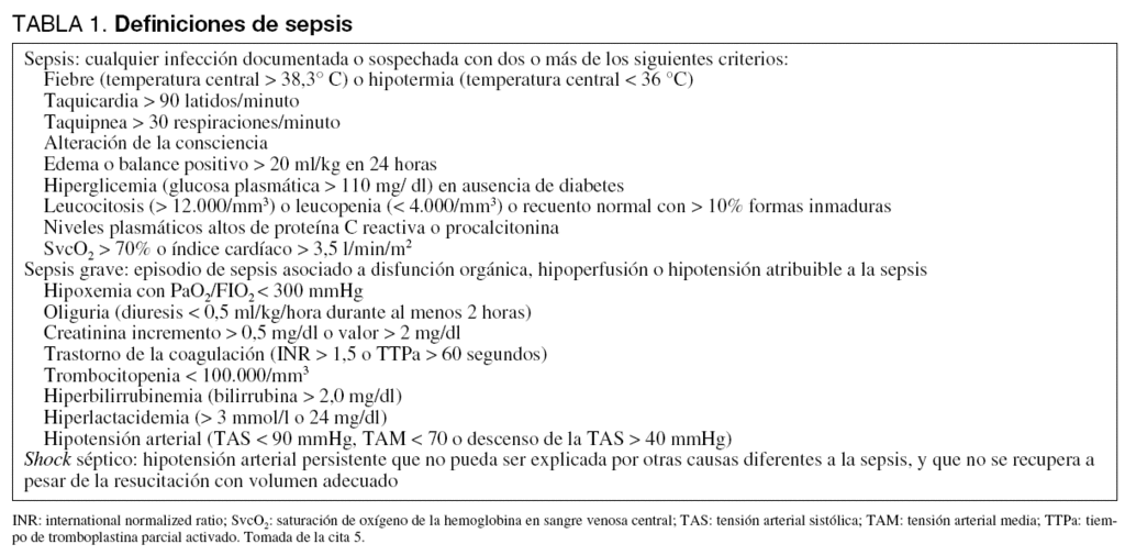 El concepto de sepsis comprende desde el SRIS del huésped a la infección grave sospechada o documentada. La sepsis grave se caracteriza o bien por la alteración aguda de la función de uno o mas órganos (función hemodinámica, renal, respiratoria, hepática, hematológica o neurológica), o bien por mala perfusión tisular (hiperlactacidemia) o hipotensión arterial (transitoria o persistente). El shock séptico es definido por la presencia de hipotensión arterial que no responde a expansión del volumen intravascular y requiere perfusión de aminas para su tratamiento.
