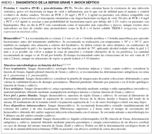 Para el diagnóstico microbiológico24 se tomarán muestras microbiológicas de cuantas localizaciones pudieran constituir sindrómicamente el foco inicial (esputo, LCR, líquidos corporales, etc.). El hemocultivo es de excepcional interés en el diagnóstico etiológico, pues resulta positivo en el 50% de los pacientes con sepsis y se ha de practicar siempre independientemente del foco infeccioso (las recomendaciones sobre la técnica de extracción se exponen en el anexo 1). Otros cultivos de utilidad por su facilidad de obtención y rentabilidad son los urocultivos, que además constituyen el foco más frecuente de sepsis en los pacientes mayores de 65 años (las muestras y técnicas recomendadas para el diagnóstico de los focos sépticos más frecuentes se exponen en el anexo 1).