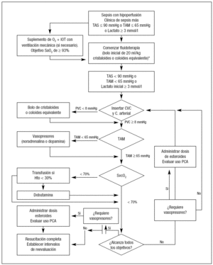 Figura 2. Algoritmo/secuencia de actuaciones para el manejo hemodinámico en la sepsis grave y el shock séptico. *En situaciones donde la tensión arterial media (TAM) se considere críticamente baja, los vasopresores pueden ser utilizados en cualquier punto de este algoritmo. IOT: intubación orotraqueal; SaO2: saturación arterial de oxígeno; TAS: tensión arterial sistólica; CVC: catéter venoso central; PCA: proteína C activada; ScvO2: saturación venosa central de oxígeno; Hto: hematocrito.