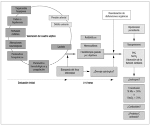 1. La identificación precoz de la sepsis es el paso fundamental para iniciar las medidas terapéuticas, el mantener un alto índice de sospecha en los pacientes infecciosos junto con el uso de instrumentos para clasificar la gravedad de la sepsis son los dos pilares para la identificación y el manejo estructurado precoz. Los paquetes de medidas para las primeras 6 horas en el hospital van dirigidos a dos objetivos básicos: control del agente infeccioso y mantenimiento de la perfusión tisular.