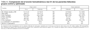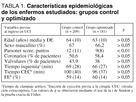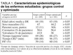 Ambos grupos presentaron características epidemiológicas similares respecto a la edad, sexo, proceso patológico, tiempo de CEC y de clampaje aórtico, FE previa a la cirugía, variables hemodinámicas, PaO2 y número de fármacos inotropos usados al llegar a UCI, a excepción de la puntuación de Parsonet, que fue ligeramente favorable para los enfermos del grupo optimizado, tal y como se observa en las tablas 1 y 2.