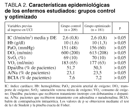 Para la realización de este estudio obtuvimos la aprobación del comité de ensayos clínicos de nuestro hospital, así como el consentimiento de cada enfermo. Incluimos a 390 pacientes todos ellos enfermos valvulares y coronarios ingresados en nuestra unidad de medicina intensiva (UCI) para control postoperatorio de cirugía cardíaca con CEC, desde agosto de 1996 hasta diciembre de 1997. Se trata de un estudio prospectivo, intervencional, aleatorizado y controlado: 181 enfermos en el grupo optimizado (GO) y 209 en el grupo control (GC). El objetivo del estudio fue valorar la influencia de la optimización hemodinámica sobre la morbimortalidad y la estancia media de los enfermos en la UCI. Durante la anestesia, todos los enfermos recibieron por vía intravenosa 0,1-0,3 mg/kg de diazepam, 0,1-0,2 mg/kg de etomidato y 0,1 mg/kg de pancuronio, manteniendo una infusión continua de propofol a 3-7 mg/kg/h y alfentanilo a 0,5-1 µg/kg/min y aportando cuando se requirió pequeñas dosis adicionales de pancuronio. El corazón fue protegido con cardioplejía hemática hipotérmica intermitente por vía anterógrada y retrógrada y, durante la CEC, se utilizó una bomba Stöcker Caps con flujos pulsátiles/peristálticos de 2,0 a 2,8 l/min, lográndose hipotermia sistémica a 32 ºC. La optimización del GO se efectuó en el postoperatorio inmediato, durante la fase de calentamiento las primeras 8 h, y tomamos como objetivo lograr una SvO2 >= 70%. Esta cifra se sitúa en el rango de valores observados en enfermos supervivientes4 y representa una relación transporte-consumo de oxígeno adecuada, entre 3 y 412: intentamos lograr una presión arterial de oxígeno (PaO2) ³ 75 mmHg, una hemoglobina (Hb) 11 g/dl y un índice cardíaco (IC)³ 2,5 l/min/m2, adecuando la pre y postcarga y, si era necesario, usando fármacos inotropos y balón de contrapulsación intraaórtica (BCIA) en este orden: dobutamina o dopamina, adrenalina o noradrenalina, BCIA. Todos los enfermos ingresaron en el quirófano con un catéter en la arteria pulmonar (Abbott Laboratories) y a las 0, 4 y 8 h se determinaron: PaO2, Hb, SvO2, IC, DO2 y VO2 en ml/min mediante analizador de gases, oxímetro (IL 1660 System, cooxímetro IL 486 de Instrumentation Laboratories) y computador de gasto cardíaco por termodilución (OXIMETRIX 3, Abbott Laboratories). También registramos en cada enfermo el tiempo de isquemia o clampaje aórtico y el de CEC, la puntuación de Parsonet13 para valoración del riesgo quirúrgico, la fracción de eyección (FE) previa a la cirugía, el número de fármacos inotropos usados, la puntuación correspondiente de disfunción multiorgánica y el número de órganos disfuncionantes según la escala de disfunción multiorgánica de Marshall14, los días de estancia en UCI y la mortalidad. Usamos el test de la t de Student para el análisis de las variables continuas y la prueba exacta de Fisher para el de las variables nominales. Todos los datos se expresan en forma de media y desviación estándar (DE), y se consideró estadísticamente significativo un valor de la p < 0,05.