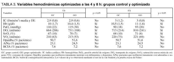 Conseguimos el objetivo de optimizar el GO hasta lograr un valor de SvO2 >= 70%, sólo a expensas de aumentar significativamente la hemoglobina un promedio de medio punto respecto al GC, mediante aporte de sangre; de hecho, a pesar de elevar de manera significativa el DO2 y la SvO2, los valores de IC y PaO2 se mantuvieron similares a los del GC, como se observa en la tabla 3. Aunque hubiera sido ilustrativo registrar la presión capilar pulmonar, creemos que no haberlo hecho no altera la validez de los resultados, toda vez que dicha variable fue medida y, en su caso, optimizada en todos los enfermos. Igualmente, consideramos que hubiera sido preferible individualizar la medición del DO2 y VO2, refiriéndolos a la superficie corporal.