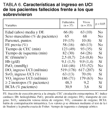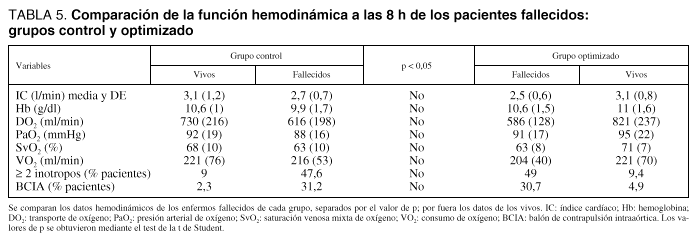 Fallecieron 37 enfermos: un 40,7% valvulares, un 55,6% coronarios y un 3,7% valvulares y coronarios; 19 fallecieron por shock cardiogénico en las primeras 48 h y otros 18 por FMO más tardíamente. Todos los pacientes fallecidos, salvo uno que presentó deterioro hemodinámico posterior, recibieron tratamiento inotropo importante durante el período de optimización: dobutamina a dosis altas o dobutamina y adrenalina asociadas, con o sin BCIA, como se aprecia en las tablas 5 y 6. Tras comparar a los enfermos fallecidos de cada grupo entre sí, observamos que presentaron una PaO2 y hemodinámica similares y recibieron fármacos inotropos en un porcentaje también similar (tabla 5). Además, ambos grupos de enfermos fallecidos en conjunto presentaron, en relación con los que sobrevivieron, un mayor riesgo quirúrgico, mayores tiempos de CEC y clampaje, mayor necesidad de fármacos inotropos y de BCIA, a pesar de lo cual presentaron menores DO2 y SvO2 con unos valores de hemoglobina más bajos, aunque mantuvieron el mismo VO2 que los supervivientes, como puede observarse en la tabla 6.