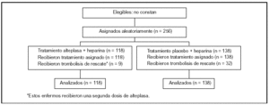 Grupo alteplasa + heparina: administración de 100 mg de alteplasa (bolo de 10 mg seguido de 90 mg en infusión durante 2 h).