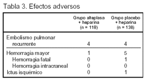 Conclusiones de los autores: el empleo de alteplasa asociada a heparina puede mejorar el curso clínico de pacientes con embolismo pulmonar submasivo, clínicamente estables, y puede prevenir un deterioro clínico que suponga una progresión en el tratamiento durante su estancia en el hospital.