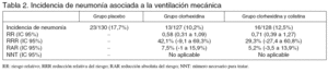Conclusiones de los revisores: las conclusiones de los autores deben ser valoradas con precaución. Conviene resaltar algunos puntos que limitan la validez de las conclusiones de los autores. En primer lugar el tamaño muestral es posiblemente insuficiente para demostrar una reducción significativa en la incidencia de neumonía. La significación estadística (p < 0,05) es alcanzada únicamente con algunos tests estadísticos, pero no con otros que resultan más habituales. Posiblemente ese tamaño muestral insuficiente es responsable de algunas diferencias que no se explican por el tipo de intervención realizada. Así, por ejemplo, la mayor reducción se observa en las neumonías de comienzo precoz en el grupo tratado únicamente con clorhexidina (Grupo placebo, 13; Grupo clorhexidina, 3). Queda sin explicar por qué esa reducción tan importante no se produce en el grupo tratado con clorhexidina y colistina (9 neumonías precoces). Esta inconsistencia se agrava al observar que durante los primeros 4 días no existe diferencia en la frecuencia de colonización traqueal entre los 3 grupos estudiados. Otras limitaciones han sido expuestas en el editorial7 que acompaña el artículo. También conviene tener en cuenta que algunos autores de este ensayo ya demostraron previamente que la administración orofaríngea de gentamicina, colistina y vancomicina disminuye la colonización orofaríngea y la incidencia de neumonías asociadas a la ventilación mecánica (de 25% a 10%), sin efectos adversos8. Posiblemente deban plantearse limitaciones éticas para realizar ensayos clínicos, como el comentado, en los que se comparen nuevos productos frente a placebo. Es razonable exigir que los nuevos productos sean comparados con alternativas que ya han demostrado su eficacia. De ese modo el grupo control no sería «penalizado» con el placebo.