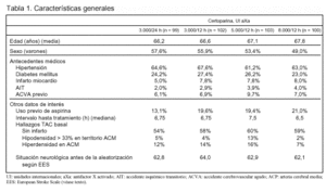 Criterios de inclusión: edad entre 18 y 85 años y diagnóstico clínico de ACVA isquémico agudo que afecta a territorio carotídeo o vertebrobasilar manifestado clínicamente por paresia de moderada a grave de un brazo, una pierna o ambos, con menos de 12 h de evolución, y con una gravedad entre 30 y 85 puntos determinada por la Escala Europea de Ictus.