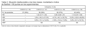 Desenlaces principales: situación funcional desfavorable definida como un índice de Barthel < 90 puntos a los tres meses. A los que fallecieron 30 (7,4%) se les asignó el valor del índice de Barthel más bajo.