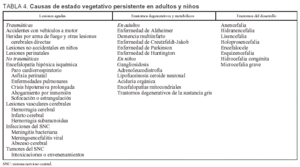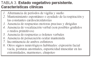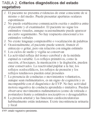 El estado vegetativo se define como persistente cuando se mantiene durante un período superior a 1 mes. Como, obviamente, se trata de una situación clínica delicada desde varios puntos de vista (médico, ético, legal, religioso), diversas sociedades científicas se han ocupado de definir criterios que fuesen aceptados por todos los profesionales sanitarios implicados. En las tablas 2 y 3 se exponen los criterios de la American Neurological Associaton (ANA)12 y de la Sociedad Española de Neurología (SEN)13.