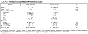El manejo de los pacientes tras el TP fue realizado en base al protocolo realizado por el equipo de trasplante de nuestro hospital. No hubo diferencias entre ambos grupos en cuanto al manejo antibiótico, inmunosupresor o ventilatorio.