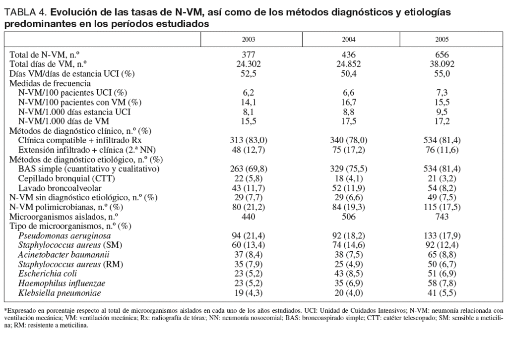 Se han diagnosticado 1.469 N-VM durante los períodos estudiados que se distribuyen en cada uno de los años, tal como se muestra en la tabla 4. La ratio de utilización de VM oscila entre el 50 y el 55% del total de días de ingreso en UCI. Se ha observado un aumento a lo largo de los tres años de las N-VM en relación con el número de pacientes ingresados (6,2% al 7,3%; p = 0,025) y con el número total de estancias (8,1% al 9,5%), mientras que las tasas se mantienen más estables cuando se relacionan con el factor de riesgo mas importante que es la VM. Han predominado las N-VM diagnosticadas mediante criterios clínicos específicos (clínica compatible e infiltrado radiológico persistente), mientras que la utilización de pruebas invasoras para buscar un diagnóstico etiológico no ha llegado al 20% de los casos en todos los años, predominando las muestras respiratorias obtenidas por broncoaspirado simple (BAS) (cualitativas y cuantitativas). Las N-VM polimicrobianas se mantienen en torno al 20%. En la etiología han predominado siete patógenos que en conjunto suponen casi el 65% de todos los aislados, destacando P. aeruginosa, S. aureus sensible a meticilina y A. baumannii.