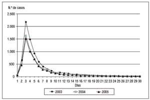 Figura 1. Distribución de los pacientes según los días de estancia en los años 2003, 2004 y 2005.