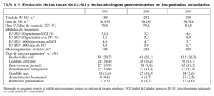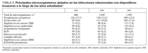 Los microorganismos responsables de estas infecciones se describen en la tabla 3, en donde se observa que existe un predominio de 10 microorganismos que en su conjunto suponen más del 70% del total de los microorganismos identificados en las infecciones controladas. Destacan en todos los períodos analizados Pseudomonas aeruginosa, Escherichia coli y Staphylococcus aureus.