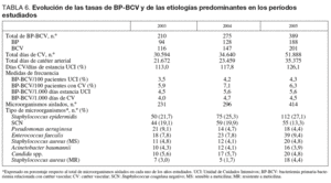 Se han diagnosticado 874 BP-BCV (464 relacionadas con catéter vascular y 410 bacteriemias primarias) que se distribuyen a lo largo de los tres años estudiados tal como se muestra en la tabla 6. La ratio de empleo de catéter vascular (que incluye los catéteres venosos centrales y los catéteres arteriales) ha aumentado a lo largo de los años, llegando a 126,1 por 100 días de estancia en UCI en el año 2005. Las tasas de BP-BCV han aumentado en relación al número de pacientes ingresados en UCI y al número de estancias mientras que los cambios han sido mínimos cuando se relaciona con el factor de riesgo más importante como son los CV. La etiología se mantiene estable, predominando los S. epidermidis y los SCN, que junto con P. aeruginosa y E. faecalis suponen más del 55% del total de aislamientos en esta infección.