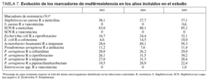 En la tabla 7 se incluye la evolución de los marcadores de resistencia seleccionados para el conjunto de las infecciones controladas. Mientras que las tasas se han mantenido más o menos estables en algunos marcadores como en SARM, SCN resistente a meticilina o P. aeruginosa resistente a los antibióticos antipseudomonales, en otros se ha observado un incremento de los marcadores de resistencia, en especial en A. baumannii, que ha llegado al 58,3% de resistencia frente a imipenem en el año 2005 y E. coli que ha aumentado la resistencia frente a ciprofloxacino hasta el 32%, y frente a cefotaxima hasta el 10% en el último año controlado. Por el contrario el porcentaje de cepas de S. aureus, SNC o Enterococcus spp. resistentes a vancomicina es prácticamente nulo.