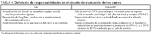 Definimos responsabilidades (tabla 4) y propusimos un circuito de control, de modo que un equipo evaluador revisase que el contenido del carro fuese acorde con el propuesto. El equipo auditor estaría formado por un facultativo y un diplomado de enfermería, instructor y monitor, respectivamente, en reanimación cardiopulmonar. Se emitiría un informe que podría ser de aptitud, aptitud condicionada o falta de aptitud. Este informe se haría llegar a la supervisión del área y al jefe de la unidad de cuidados intensivos. En función del resultado de la evaluación, se determina la periodicidad de la siguiente evaluación (fig. 1).