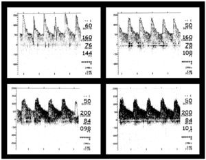 Figura 1. Meningitis meningocócica. Arriba: velocidad de flujo disminuida al ingreso (GCS = 7) en ambas arterias cerebrales medias. Abajo: velocidad de flujo normal o elevada al alta (GCS = 14). GCS: escala de coma de Glasgow.
