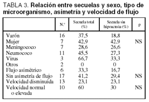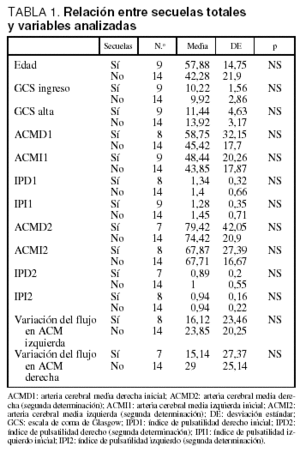 En 6 pacientes se encontró una asimetría entre la velocidad de flujo de la ACM derecha e izquierda, pero no se encontró una relación estadísticamente significativa entre la asimetría y las secuelas. Tampoco alcanzó significación estadística la relación entre la aparición de secuelas y las velocidades de flujo en el estudio inicial (tabla 3).
