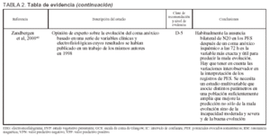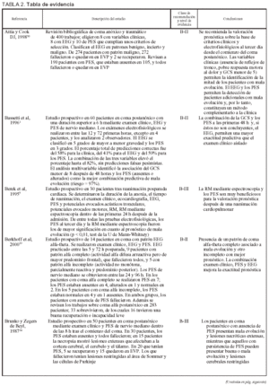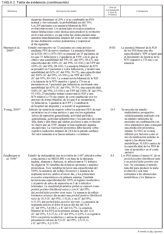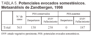 En 1998 Zandbergen et al13 después de establecer unos criterios de selección analizaron un total de 33 estudios con 14 variables pronósticas, entre las que se encontraban la ausencia bilateral de PES durante la primera semana y los registros EEG con patrón de coma alfa, patrón de salvas de supresión o isoeléctrico. El número total de pacientes explorados con PES fue de 563: en 376 los PES estaban conservados; de ellos, 138 evolucionaron bien y 238 quedaron en EVP o fallecieron. Los 187 restantes tenían una ausencia de PES bilateral y todos murieron o quedaron en EVP no hubo ninguna recuperación en este grupo (tabla 5).