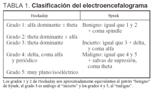 Las 2 escalas de graduación de las alteraciones del EEG más habituales en el coma anóxico son las de Hockaday et al27, de 1965, y la de Synek de 199028, que exponemos en la tabla 1.