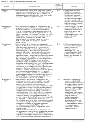 Por último, referimos el trabajo más reciente no incluido en los metaanálisis de los PES, publicado por Nakabayashi et al37 en el año 2001, en el que se estudia a 30 pacientes de manera muy temprana, entre 40 y 70 min después de la recuperación espontánea, y se establece la evolución al mes con los siguientes resultados: 12 pacientes conservaban los PES, 8 de ellos se recuperaron al cabo de los 10 días y 4 evolucionaron mal. Los 18 que no tenían PES fallecieron. Los valores estadísticos para la conservación de los PES tuvieron una sensibilidad del 100% (IC del 95%, 68,5), una especificidad del 81,8% (IC del 95%, 69,4), un valor predictivo positivo del 100% (IC del 95%, 84,8), un valor predictivo negativo del 100% (IC del 95%, 84,8) y una p < 0,0001.