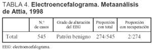 En la revisión del EEG, se agrupa a 545 pacientes; 274 tenían un patrón maligno de la clasificación de Synek28 de 1990, de los cuales sólo 2 tuvieron buena recuperación; el resto falleció o quedó en EVP (tabla 4). El autor no hace referencia a los patrones incierto y benigno y sus respectivas evoluciones.