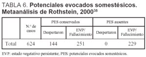 En el año 2000 Rothstein38 llevaron a cabo un estudio de metaanálisis con 16 trabajos publicados sobre los PES y la evolución final (tabla 6). En 395 de los 624 pacientes estudiados se encontraron respuestas somestésicas corticales; 144 despertaron y 251 fallecieron o quedaron en EVP. La ausencia bilateral se dio en 229, no hubo recuperación alguna y todos evolucionaron hacia el EVP o fallecimiento.