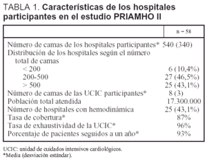 El registro PRIAMHO II es un estudio de cohorte con registro hospitalario de IAM y seguimiento a un año. Se recogieron, de manera prospectiva, los datos de los pacientes con IAM que ingresaron consecutivamente en las unidades de cuidados intensivos cardiológicos (UCIC) de 58 (71,6%) de los 81 hospitales españoles seleccionados. Esta selección fue hecha al azar entre los 165 hospitales que atienden pacientes con IAM, disponen de una UCIC y pertenecen a la red de asistencia pública o están concertados con ella. De los 81 seleccionados, 7 (8,6%) declinaron participar y fueron sustituidos por otros tantos de características similares. Únicamente 63 superaron la fase piloto, y 5 de ellos fueron finalmente eliminados del análisis por no cumplir los criterios de control de calidad, quedando 58 válidos. El reclutamiento tuvo lugar del 15 de mayo al 15 de diciembre de 2000. La selección aleatoria de hospitales se estratificó respetando la distribución por número de camas (< 200, 200 a 500 y > 500).