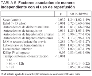 En un modelo de regresión logística confirmatorio ajustado por edad, sexo, antecedentes de diabetes, tabaquismo, IAM previo y localización del IAM, la odds ratio (OR) de la reperfusión fue 0,71 (intervalo de confianza [IC] del 95%, 0,57-0,88) para mortalidad a los 28 días. Al ajustar además por la clase de Killip, la OR dejó de ser estadísticamente significativa (OR, 0,84; IC del 95%, 0,66-1,08). La interacción entre la clase de Killip y la reperfusión no fue significativa. Las OR de la reperfusión para la mortalidad a un año de los supervivientes a los 28 días fueron 0,53 (IC del 95%, 0,38-0,74) y 0,57 (IC del 95%, 0,40-0,81), respectivamente.
