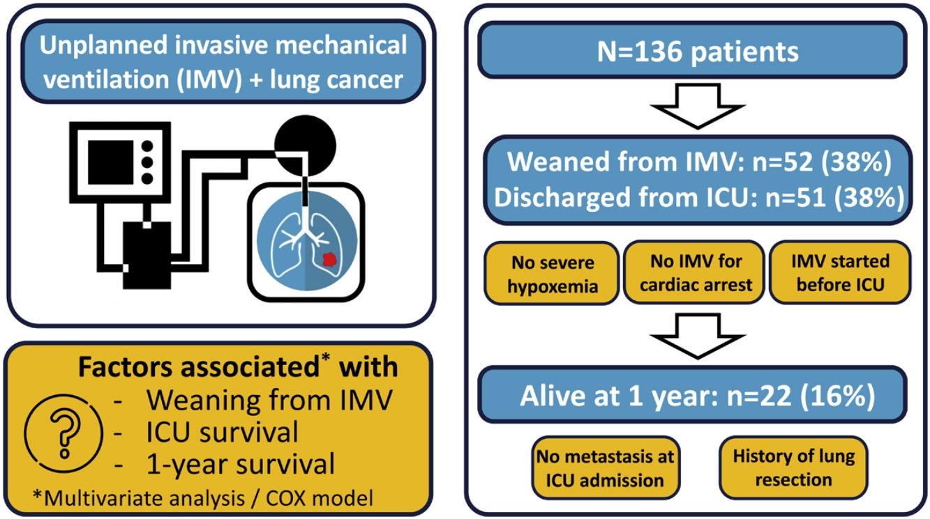 ResultsOf the 136 patients included in the analysis (age 64 (9) years, male 110 (81%), metastatic disease 97 (62%)), 52 (38%) were weaned from IMV, 51 (38%) were discharged from ICU and 22 (16%) were alive at 1year. The main indication for intubation was acute respiratory failure. In multivariate analysis, PaO2/FiO2 >175mmHg at ICU admission and intubation before ICU admission were associated with successful weaning from IMV while intubation for cardiac arrest was associated with weaning failure. Same factors were associated with ICU survival. Absence of metastasis at ICU admission and lung resection surgery were independently associated with 1-year survival.