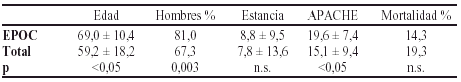 Métodos: Estudio prospectivo descriptivo de los enfermos con EPOC descompensado que ingresan en nuestra UCI entre enero de 1996 y enero de 2002. Se analizan, entre otras, las siguientes variables: Edad, sexo, enfermedad de base, APACHE, estancia, mortalidad, ventilación mecánica (VM), infecciones, microorganismos causales y antibióticos (atbs) utilizados.