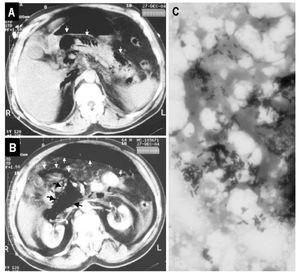 Figura 1. Una tomografía computarizada abdominal con contraste muestra la presencia de gas en cuerpo y cola del páncreas (flechas blancas) (A) y aire libre intraperitoneal (flechas blancas) y retroperitoneal (flechas negras) (B). Tinción de Gram revelando bacilos grampositivos (C).
