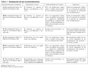 Se capacitó a los expertos en la metodología a seguir y se acogió la propuesta del Garding of Recommendations Assessment, Development and Evaluation (GRADE) Working Group4 para emitir el grado de recomendación y evaluar la calidad de la evidencia, de acuerdo con los criterios expresados en la tabla 1.
