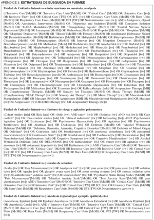 2. Tipos de pacientes. Adultos, críticamente enfermos o ingresados en UCI, en alguna de las siguientes circunstancias: sin intubación endotraqueal; con intubación endotraqueal y VM; en proceso de retirada de la VM y del tubo endotraqueal; en postoperatorio inmediato de cirugía cardiovascular; con EPOC, con SDRA, ancianos, mujeres embarazadas o en lactancia; politraumatizados; neurocríticos; con insuficiencia renal; con insuficiencia hepática; con agitación y/o delirio y/o síndrome de abstinencia. Se excluyó el síndrome de abstinencia por alcohol o psicoestimulantes.