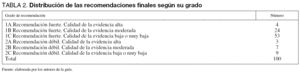 La distribución de las recomendaciones finales según el grado de recomendación figura en la tabla 2. En el Apéndice 4 figura la versión inglesa de todas las recomendaciones, su grado de recomendación y nivel de evidencia.