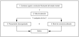 Justificación. El delirio se define como una alteración de la conciencia con inatención, acompañada de alteraciones cognitivas y/o de percepción que se desarrollan en un corto período de tiempo (horas o días) y fluctúan con el tiempo45. Los cambios cognitivos se manifiestan como alteraciones de la memoria, desorientación, agitación o habla confusa. Las alteraciones de la percepción se manifiestan como alucinaciones (usualmente visuales), ilusiones y/o delusiones. A menudo el delirio se confunde con la demencia, pero las alteraciones cognitivas que se presentan en ambas son diferentes. La demencia se define como una alteración de la memoria y la alteración cognitiva asociada a ella. Se desarrolla en meses o años y empeora progresivamente. El diagnóstico diferencial entre ambas es posible en la mayoría de los casos46,47.