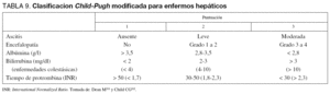 En presencia de disfunción hepática, la mayoría de los medicamentos están sujetos a un aclaramiento disminuido, vida media aumentada y acumulación de metabolitos potencialmente tóxicos o con actividad metabólica, cuya repercusión clínica es poco conocida. Estudios experimentales han demostrado que en pacientes cirróticos la transmisión opiodérgica puede alterarse, aumentando la afinidad del receptor por los opioides. Además, estos pacientes tienen aumentada la sensibilidad al GABA, potenciando los efectos de las benzodiacepinas. Algunos cuadros de encefalopatía subclínica pueden precipitarse con la administración de sedantes y opioides. En pacientes con insuficiencia hepática la clasificación de Child-Pugh212,213 se utiliza como guía para la elección de fármaco y para establecer la dosis3,211,214-217 (tabla 9).