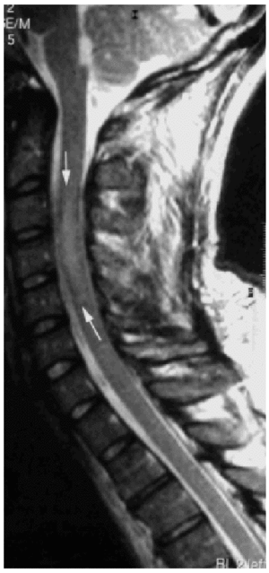 Se instaura tratamiento con una megadosis de corticoides. A las 12 h del ingreso se agrava la paresia en ESI (fuerza 2/3: movimiento activo eliminando la gravedad), con preservación sensitiva, por lo que se lleva a cabo una resonancia magnética nuclear que objetiva una contusión medular cervical que compromete los segmentos C3-C5.