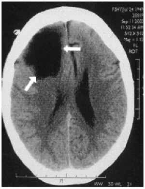 Paciente de 54 años con antecedentes de hipertensión arterial que acude a urgencias por un episodio brusco de caída al suelo, con disartria, desviación de la comisura bucal y de la mirada a la izquierda, vómitos y una crisis tonicoclónica generalizada. Ingresa en la Unidad de Cuidados Intensivos (UCI) con la sospecha de accidente cerebrovascular agudo, con los ojos abiertos, midriasis bilateral, desconexión del medio sin respuesta a estímulos y desviación de la mirada a la izquierda, por lo que se procedió a su intubación y conexión a ventilación mecánica. Se realiza una tomografía computarizada craneal que objetiva quiste aracnoideo gigante con gran efecto expansivo, desviación de la línea media y desviación de tronco. Se efectúa una intervención urgente con drenaje del quiste. La evolución inmediata es buena; al alta de la UCI la paciente se encontraba consciente y orientada, colaboradora y sin focalidad neurológica. Fue derivada a la planta de neurocirugía para la realización de una derivación quiste-peritoneal.