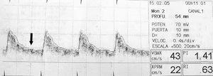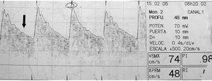 Mujer de 45 años con antecedentes de hipertensión arterial (HTA) sistémica que ingresa por hemorragia subaracnoidea (HSA) espontánea Fisher 3, grado III de Hunt y Hess. Se realiza embolización de un aneurisma de arterial cerebral media izquierda. Tras el procedimiento presenta disminución del nivel de conciencia (Glasgow Coma Scale [GCS] 5) y anisocoria derecha. En la tomografía computarizada (TC) de control aparece HSA con invasión intraventricular y dilatación del sistema ventricular, Fisher 4. En el doppler transcraneal (DTC) de todas las arterias cerebrales existe aplanamiento diastólico sugestivo de hidrocefalia (fig. 1). Se procede a la colocación de un drenaje intraventricular con débito de 90 cc de líquido cefalorraquídeo (LCR) en las primeras 5 horas con mejoría de la clínica y normalización del DTC tras el procedimiento (fig. 2).
