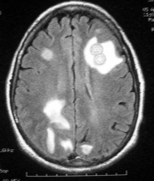 Mujer de 60 años con uveítis crónica en tratamiento con corticoides. Ingresa por cuadro de tres días con cefalea, vómitos y fiebre, disminución del nivel de conciencia y disfasia. Al ingreso presentaba una temperatura de 39 ºC, crisis tónico clónicas y flúter auricular con hipotensión. Se intubó y conectó a ventilación mecánica. Se le realizó tomografía computarizada craneal con contraste y resonancia magnética donde se ven múltiples lesiones en ambos hemisferios cerebrales y en el cerebelo con captación en anillo (figs. 1 y 2) y edema asociado, que brillan en difusión, compatibles con abscesos piógenos. No se aisló ningún germen en sangre, orina, aspirado traqueal ni líquido cefalorraquídeo. Se realizaron estudios para encontrar el foco de la infección, exploraciones del área otorrinolaringológica, fondo de ojo, ecocardiografía transesofágica, etc., siendo todos normales. Tras tratamiento con meropenem la paciente evolucionó favorablemente, siendo dada de alta asintomática al Servicio de Neurología.