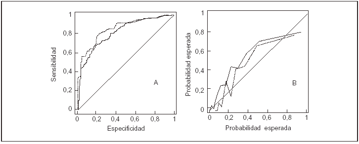 Figura 2. Gráficos correspondientes al sistema APACHE II. A: Curva ROC. B: Curva de calibración. La línea continua expresa los resultados de la serie de los años 1999-2000 y la línea de puntos los del año 2001. Podemos observar la mejoría tanto en la curva de calibración como en la curva ROC.