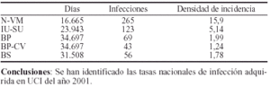 Conclusiones: Se han identificado las tasas nacionales de infección adquirida en UCI del año 2001.