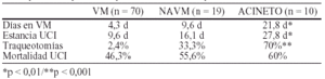 Resultados: Se diagnosticaron un total de 29 pacientes con NAVM (41,4%). El germen mas frecuentemente aislado fue el AB en un total de 10 casos (34,5%). El total de días en VM, así como la estancia aumenta de forma importante si el paciente padece una neumonía por AB respecto la producida por otro germen. El aumento de los días en VM implica un aumento significativo de los pacientes que tienen que ser sometido a traqueotomía.