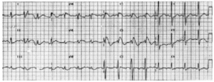 Figura 1. Electrocardiograma con imagen de bloqueo de rama derecha y elevación del ST en las derivaciones V1 y V2, compatible con síndrome de Brugada.
